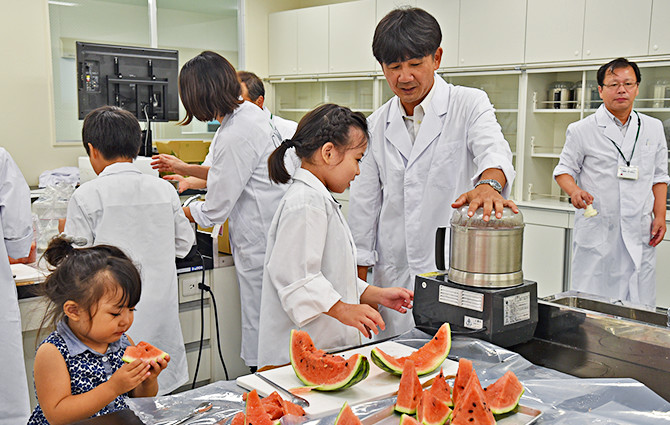 「実感・体感コープ食の安全探検隊」で、スイカの放射性物質検査を体験する子どもたち