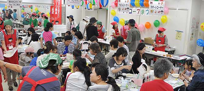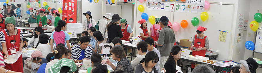 店舗や宅配センターで開催するまつりや、地域へのまつりの参加があります。コープ商品の試食を提供したり、体験型のイベントを企画するなど、組合員が主体となって楽しく活動を広げています。