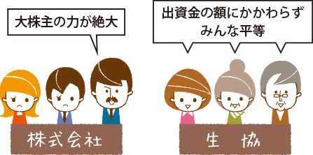 一方「生協」の場合、出資するのは組合員です。消費者が出資して組合員になることで、生協の商品やサービスを利用できます。剰余金があれば、組合員に配当を行う場合がありますが、配当額には上限を設けています。そして、出資金の額に関係なく、組合員一人ひとりが平等に意見を言う権利があります。組合員から出された意見や要望は生協の運営に反映しています。生協は非営利団体で、消費者のくらしをより良くすることを目的に運営されています。