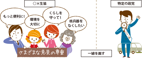 消費生活協同組合法第2条第2項で、「消費生活協同組合はこれを特定の政党のために利用してはならない」と規定され、生協として特定の政党や候補者を支援することはありません。