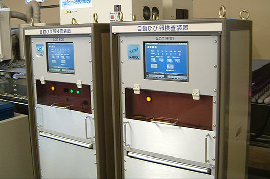卵をやさしくたたき、殻から伝わる波長によってヒビ割れを検知しています。