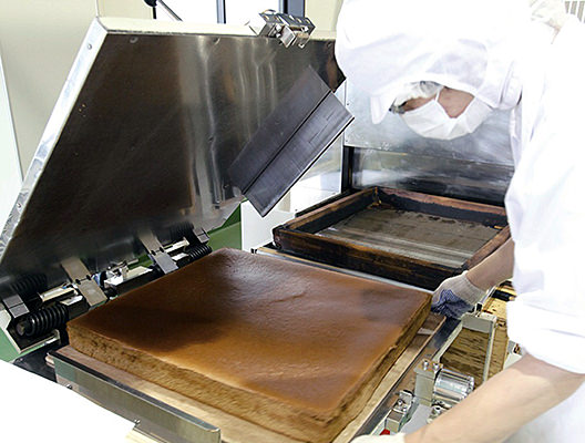こだわりの食感は職人による手作業によって作られています。カステラは気温や湿度によって変化してしまうため、日々天候に注意し、昔ながらの製法で熟練された職人が一枚一枚丁寧に焼き上げています。