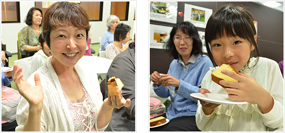 「あったかい〜」「ふわふわ!」 焼きたてのカステラを試食