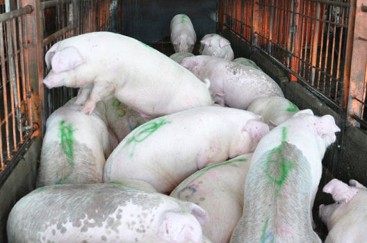 各農場から運ばれてきた豚たち。興奮し体温が上昇しています。そのままと畜すると食味が落ちるため、シャワーを浴びさせ、一晩落ち着かせます。