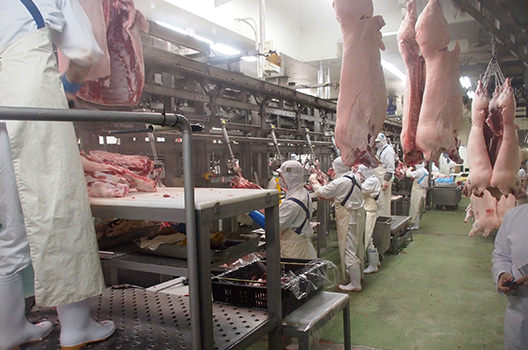 ここからは素早い処理がおいしさの決め手です。流れ作業で解体します。肉色の基準など、日本格付協会の基準を満たした物のみを茶美豚として出荷しています。