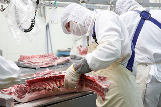受け入れ時に豚の健康状態をチェックし、その後部分肉に加工されるまで番号をつけて管理しています。このため生産者までわかるようになっており、 他の豚と混ざる心配はありません。また温度管理や品質の安定、異物混入がないように出荷までさまざまなチェックを重ねています。