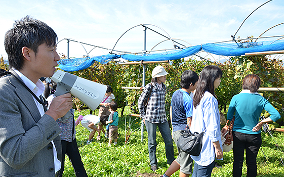 ぶどう畑で栽培の工夫を聞く参加者の皆さん