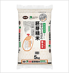 ユーコープの組合員に人気の高い無洗米の胚芽精米。胚芽精米は、玄米を精米する際にヌカを取り除き、「胚芽」を80%以上残したお米です(一般精米は胚芽もすべて取り除いたものです)。