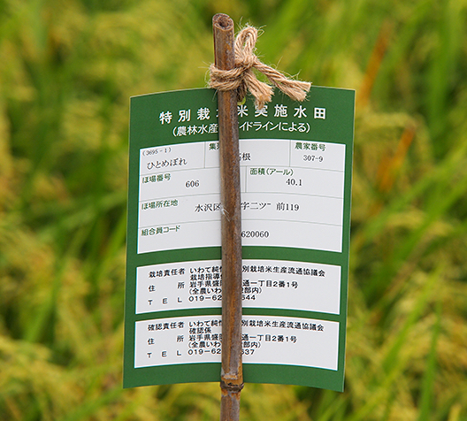 農林水産省のガイドラインに基づいた「特別栽培米」であると示す〝緑の札"