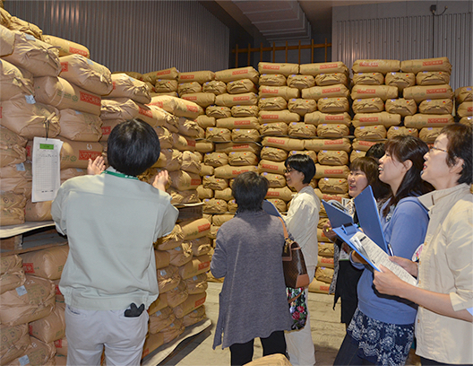 収穫したお米は、生産者がモミのまま、または玄米にして、カントリーエレベーターや低温倉庫に搬入します。カントリーエレベーターでは、目視検査でモミを品定めし、基準に合わなければ受け入れません。また低温倉庫では1袋ずつ中の米を品質検査し、格付け(ランク)が記録されます。その厳しさから「消費者に安心して食べられるおいしいお米を届けたい」という生産者の想いが伝わります。またコープの担当者が毎年産地の栽培や生産管理状況の点検を行っています。