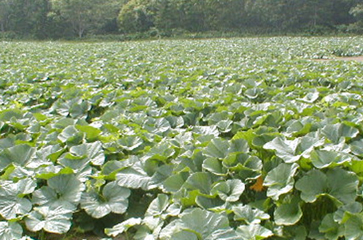 大きく葉を伸ばし、太陽を浴びてのびのびと育つかぼちゃは、この畑でじっくり熟し、一玉一玉手作業で丁寧に収穫されます。