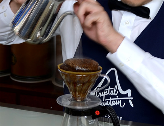 滴が落ちなくなるまで約20秒待ち、粉が膨張したら、4回に分けて湯を注入れます。