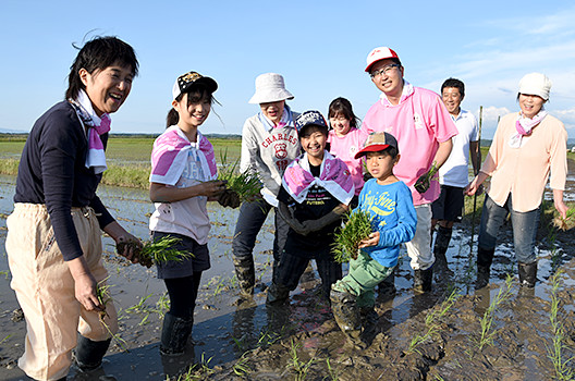 組合員が田植えや稲刈りに参加し、交流を進めています。