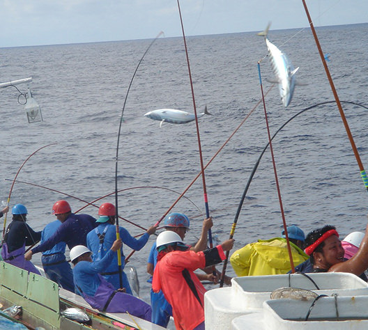 「一本釣り」の素晴らしさは、かつおの群れからごく一部の必要な大きさのかつおだけを釣り上げるので、群れ自体を保全できることです。