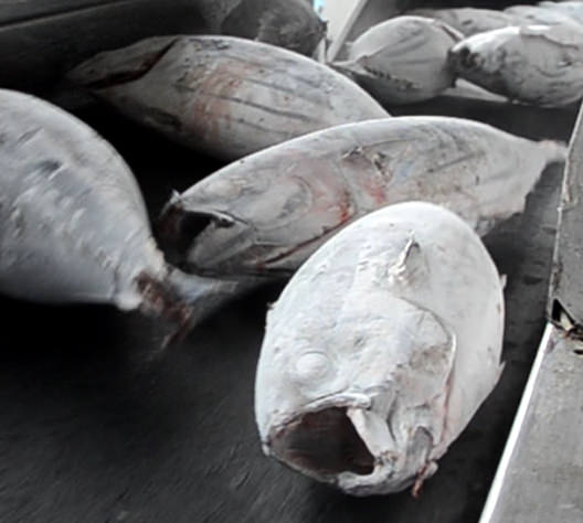 日光丸の船上で急速凍結したかつおは、港に着くと凍ったままサイズ別に選別され、マイナス60℃の冷凍倉庫にストックされます。