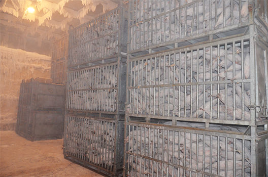 -60℃の冷凍庫内。3段積みのカゴはひとつでかつお1トン分です。