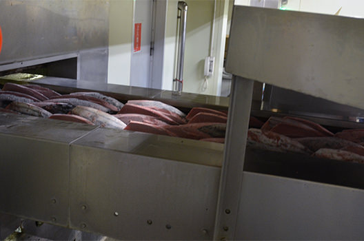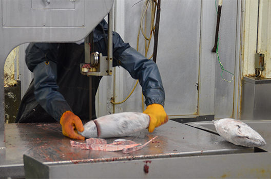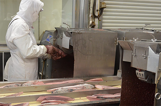 加工工場では、かつおを冷凍のまま可食部のみに加工し、すみやかに再び冷凍庫で保存します。かつおの鮮度を維持するため、加工には正確さとスピードが要求されます。
