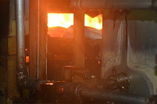 かつおの表面をサッとあぶる「たたき」は、高温ですばやく焼き上げることがポイントです。焼き釜自体は自動化されていますが、藁の火加減は職人が常に調整しなければ上手に仕上がりません。焼き加減を失敗すると身の中心部が黒っぽく変色してしまうのです。釜の内部は600℃以上、夏場は室温も50~60℃近くになる大変な作業です。