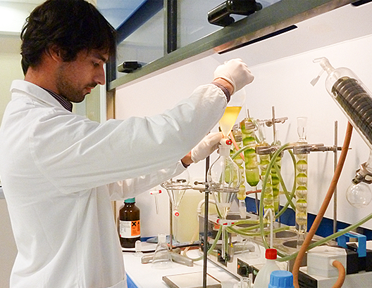 品質管理室にて。エクストラバージンオリーブオイル以外のものが混ざっていないかチェックをしているところ
