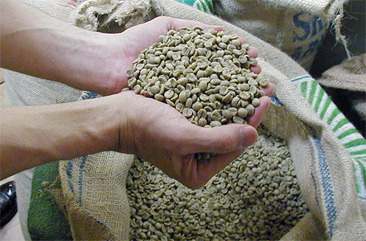 生豆は60~70kg入りの麻袋で入荷。焙煎後の香気とはかけ離れた青臭いにおいがする。