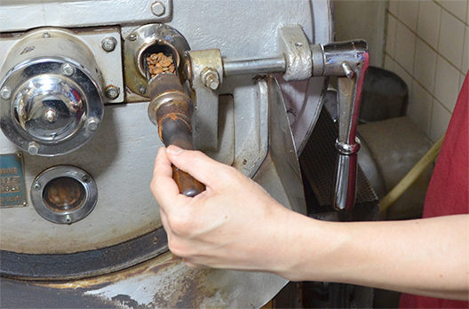 熟練の焙煎職人が、220℃まで予熱した直火式焙煎機のドラムに4種類の豆を投入。その日の気温や豆の状態を確認しながら、長年培ってきた五感を駆使し、つきっきりで焼き上げます。