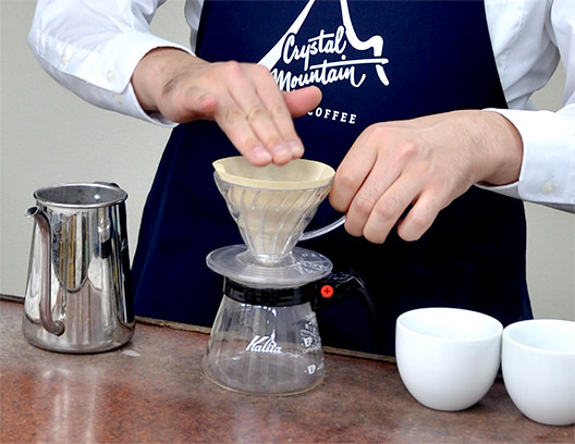ペーパーフィルターは貼り合わせ部分をたがいちがいに丁寧に折り、ドリッパーにセットします。