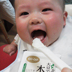 初めてのお豆腐からあげています。すごい笑顔で食べるんですよ!もっとちょーだいってお口を大きく開けるのがかわいいです。二歳のお姉ちゃんも木綿をパクパク食べます。