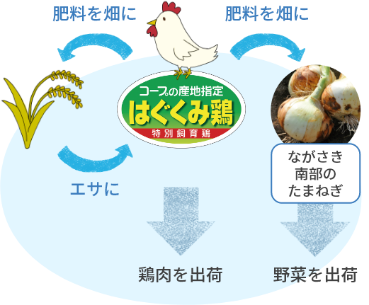 また、飼料用のお米のほかに、ながさき南部生産組合「ながさき南部のたまねぎ」の肥料にも、佐賀の「はぐくみ鶏」の鶏フンが利用されています。