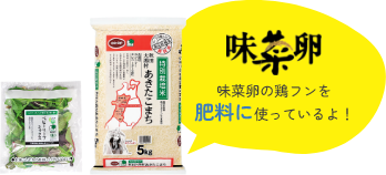 例えば…秋田大潟村あきたこまちやベビーリーフミックスは、味菜卵の鶏フンを肥料に使っています。